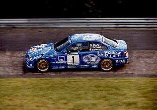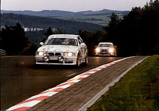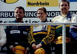 | Sabine Reck auf der Nordschleife - zusammen mit ihren Partnern Johannes Scheid (rechts) und Hans Widmann gewann sie als erste Frau das 24h-Rennen | |